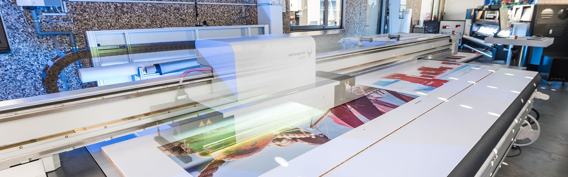 Unser UV-Drucker mit Primer- und Weißoption eignet sich zum Beispiel für durchsichtige und schwierige Materialien. Für besonders umweltfreundliche und geruchsarme Drucke kommt unser Latexdrucker zum Einsatz. Sie möchten eine sehr große Fläche bedrucken? Unser Großformatdruck schafft ganze 3,2 Meter Breite – und das bei einer Geschwindigkeit von 200 Quadratmetern pro Stunde.