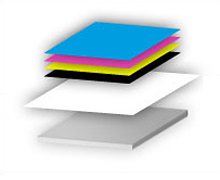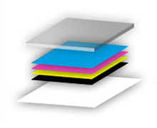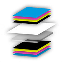 Zwei Farbschichten mit einem weißen Zwischendruck (Farbe + Weiß + Farbe) werden im 3-Schicht-Druck-Verfahren auf transparenter Folie aufgetragen. Für hinterleuchtete Anwendungen mit Nacht- und Tagwirkung werden auf diese Weise die qualitativ besten Ergebnisse erzielt.