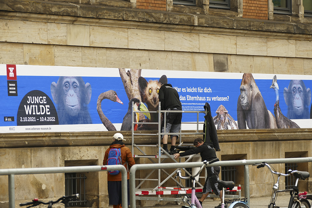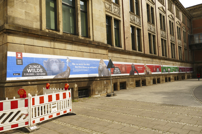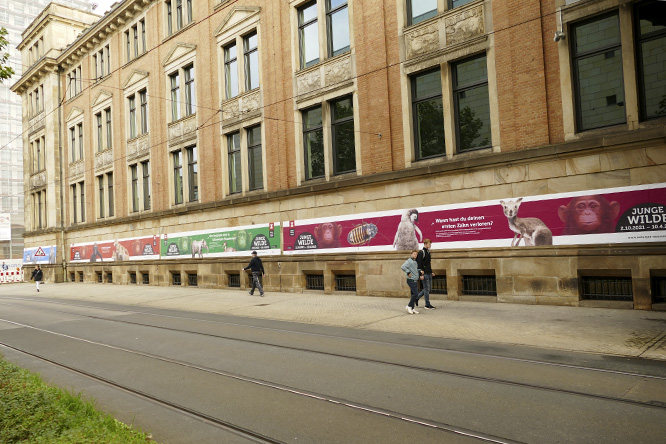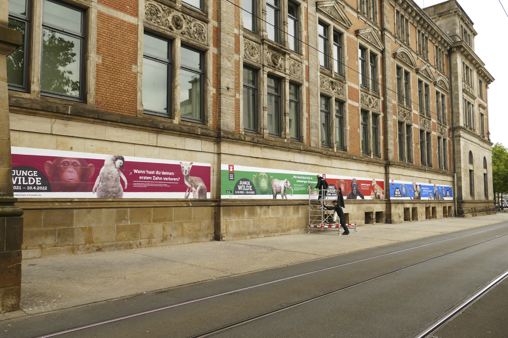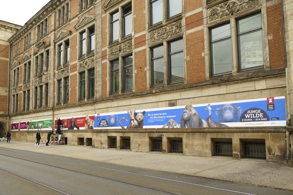 Auf fast 90 Metern Länge wurde das denkmalgeschützte Gebäude mit von uns gedruckter Folie beklebt. Diese kündigt die neue Sonderausstellung „Junge Wilde – Tierisch erwachsen werden“ an, die vom 2. Oktober 2021 bis 10. April 2022 läuft.