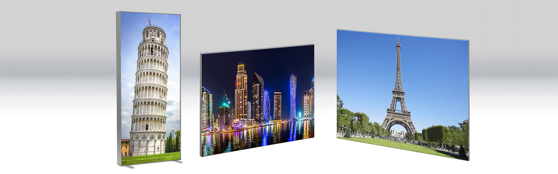 Hochwertige Spannrahmen aus eloxiertem Aluminium sind dezent und variabel. Als stylisches Dekoelement an der Wand, als Leuchtkasten für packende Werbung, freistehend als Display oder als schalldämmender Akustik-Raumteiler lassen sie sich vielseitig einsetzen.